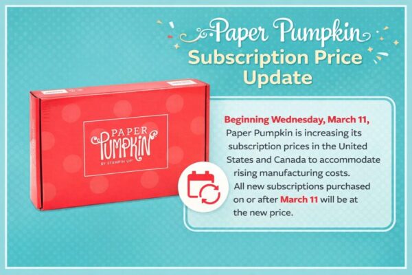 Beginning Wednesday, March 11, Paper Pumpkin is increasing its subscription prices in the United States and Canada to accommodate rising manufacturing costs. All new subscriptions purchased on or after March 11 will be at the new price.