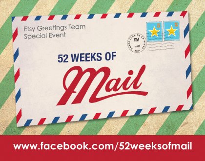 Blogger V-Grrrl tapped me on Facebook to let me know about 52 Weeks of Mail, a challenge to send at least one card a week for a year, starting October 9th (this Sunday). It's sponsored by Etsy Greetings Team. Here's the FB Info blurb from their page: