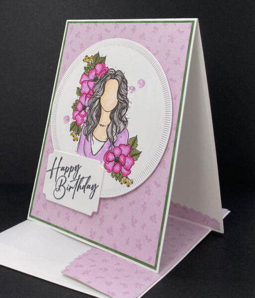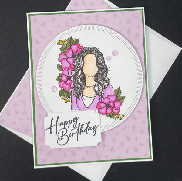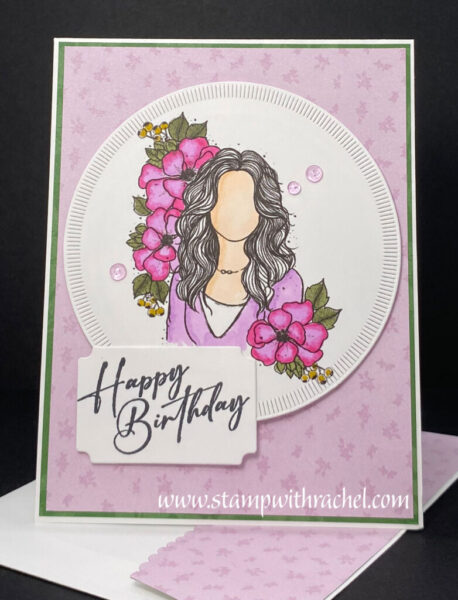 The focal point features an elegantly stamped woman’s silhouette with flowing hair, perfectly framed within a circular die-cut border that adds dimensional interest to the design. The soft Fresh Freesia and Melon Mambo color palette creates a dreamy, feminine aesthetic that’s perfect for celebrating someone special.