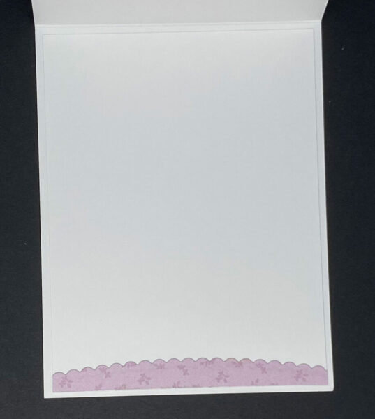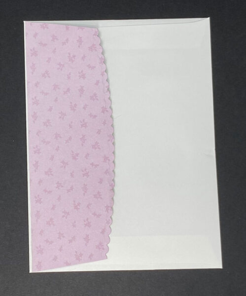 The card’s coordinating inside panel and envelope liner showcase the beautiful versatility of Stampin’ Up!’s Envelope Dies. The left image reveals the card’s interior, featuring a delicate scalloped border along the bottom edge that perfectly frames the clean white space for a personal message. The right image shows the envelope’s coordinating envelope flap, where the same Fresh Freesia patterned paper creates a sophisticated diagonal design across the flap. Using the Envelope Dies for both elements creates a cohesive, polished look that ties the entire card set together beautifully.