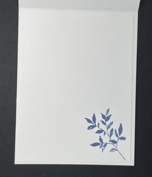 The card’s interior elegantly continues the botanical theme with a simple sprig stamped in Misty Moonlight and positioned in the corner, leaving ample space for a heartfelt personal message. The coordinating envelope features a decorated flap using the same designer series paper as the card’s front, creating a cohesive and polished presentation throughout the entire stationery set.