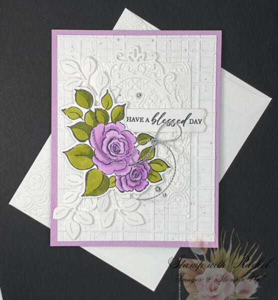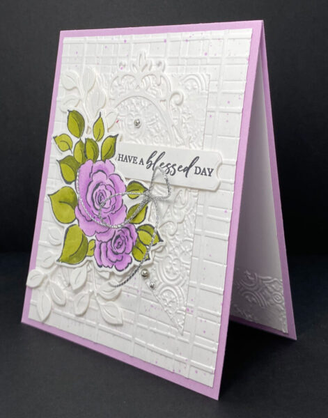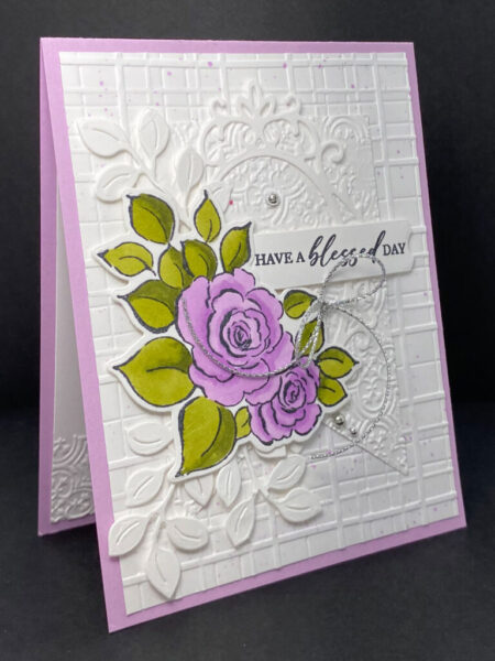 This card showcases multiple layering techniques that create beautiful depth and visual interest. The white background features raised embossed patterns you can actually feel, including decorative flourishes from the Distressed Tile 3D Embossing Folder and the Forever Plaid 3D Embossing Folder pattern along the sides. The “Have a blessed day” sentiment appears on a crisp white banner positioned perfectly above the roses, ensuring the message stands out clearly.