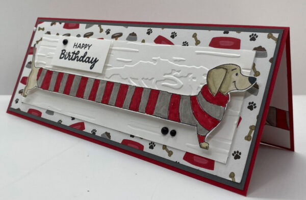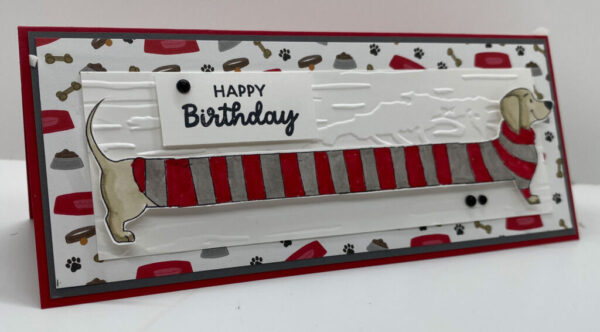 This charming handmade birthday card features an adorable dachshund (wiener dog) as the star of the show. The long-bodied pup is dressed in a festive Real Red and Gray Granite striped sweater that stretches across the entire width of the card, perfectly showcasing the breed’s famously elongated body. The dog’s sweet face and wagging tail add personality and warmth to the design.