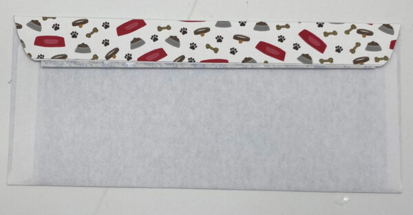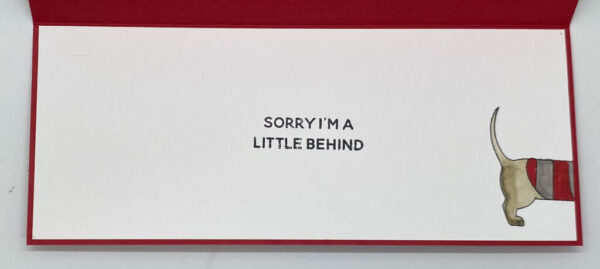 The left image shows the inside of a greeting card with a playful message that reads “SORRY I’M A LITTLE BEHIND” accompanied by an illustration of a dog’s rear end and tail. The right image displays a matching envelope decorated with a cute pattern of dog-related items including food bowls, bones, paw prints, and other pet accessories in colors that coordinate with the card’s design.