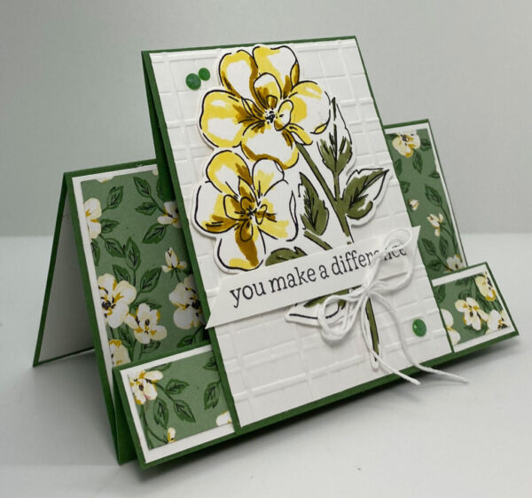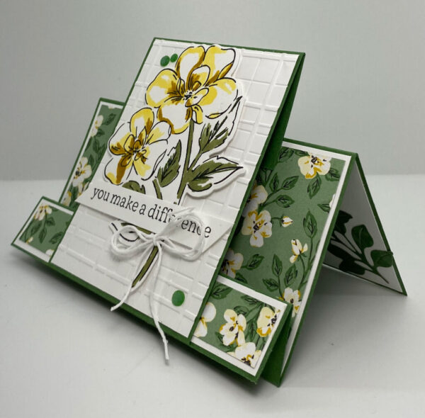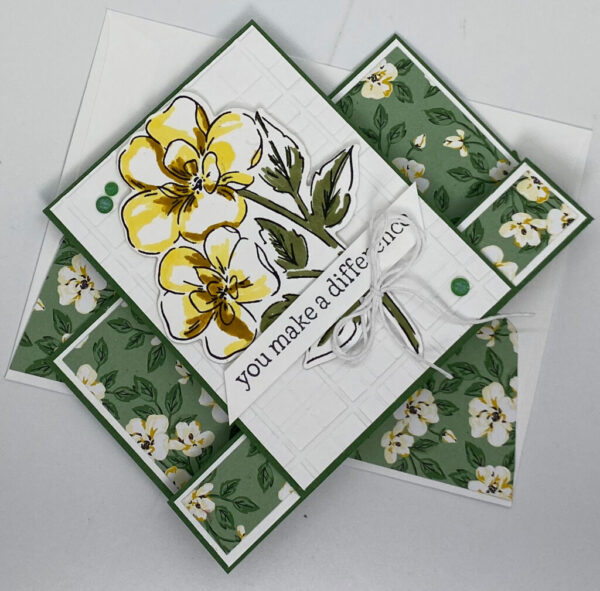 This handmade greeting card features a unique center step-fold design with Garden Green borders and floral patterned panels (Lovely Garden Designer Series Paper) on each side. The center showcases two large yellow and white flowers with Garden green leaves, created using ink blending techniques over stamped line art.