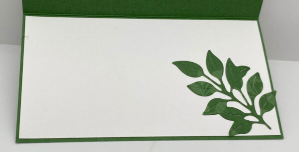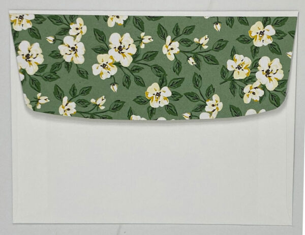 The inside of the card maintains the garden theme with an elegant die-cut branch featuring Garden Green leaves that gracefully extends across the Basic White interior panel. The coordinating envelope continues the cohesive design story, with the flap lined using the same designer series paper that appears on the card’s front panels.