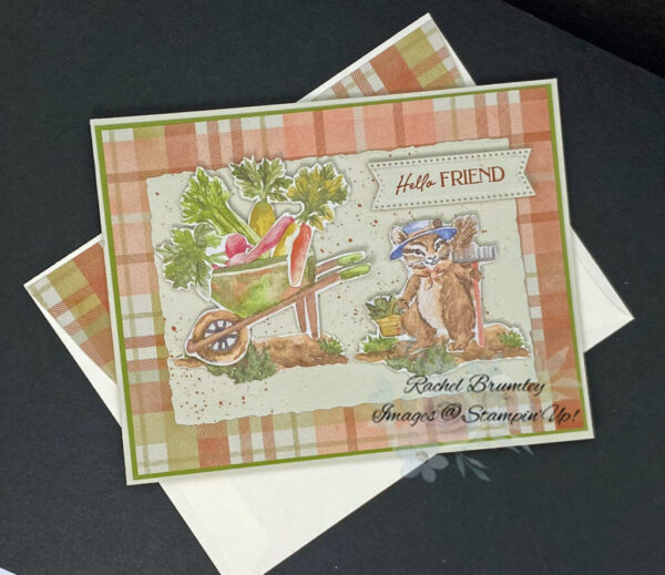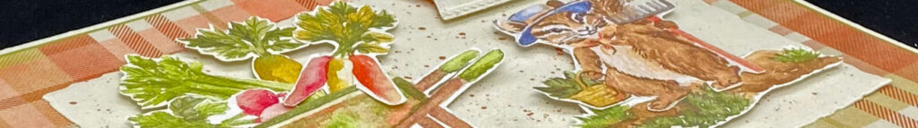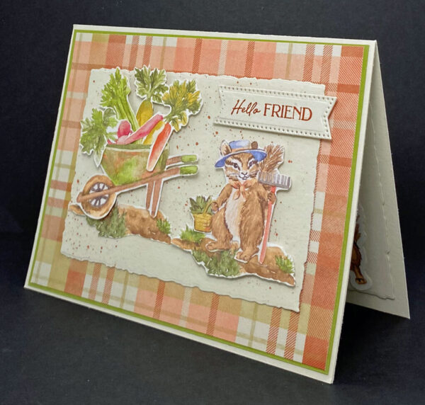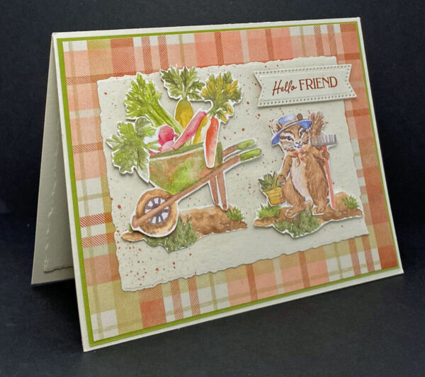 Images: Punch out the vegetables, cart, squirrel, and grass background from the Storybook Moments paper. Trim all images, leaving less than 1/8″ border, and layer as shown using Stampin’ Dimensionals.