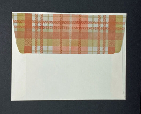 Envelope: Attach a 6″ x 2 1/4″ piece of the same plaid pattern to the envelope flap and trim to fit.