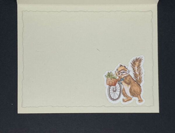 Inside Panel: Die cut Basic Beige (5 1/4″ x 4 1/8″) with the large Deckled Rectangle die. Add a squirrel image to the lower right corner and attach the panel inside the card.