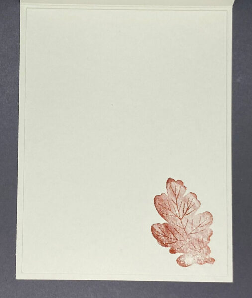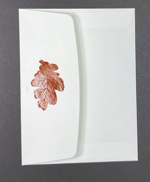 The left side displays the inside of a Basic Beige card featuring an elegant oak leaf stamped in a warm autumn tone of Cajun Craze. The right side shows the matching envelope flap with a similar oak leaf design that perfectly complements the card’s interior.