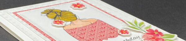 I printed this digital image (non-SU) directly from my computer for the main focal point. The patterned papers come from the Floral Impressions 12″ x 12″ Designer Series Paper, which I used for both the top (blouse) and border elements. To create the decorative scalloped edge on the top, I used the Fancy Borders Dies. The layered floral embellishments were die-cut from the Extraordinary Floral Washi Tape for added dimension and texture.