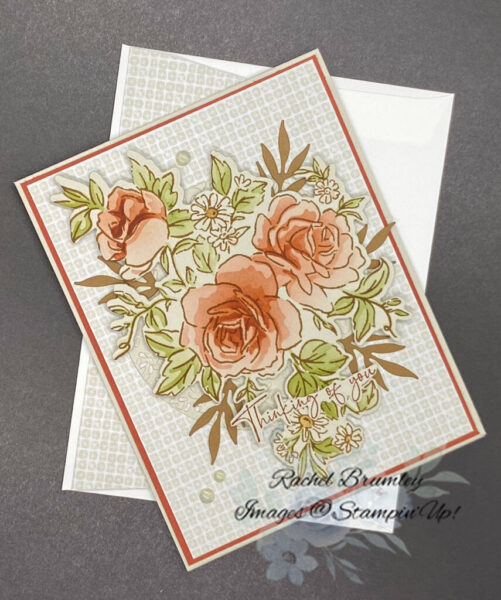 Use Stampin’ Dimensionals behind the large image to add dimension and make them pop off the card. Stamp or add your “Thinking of you” sentiment in the center of the arrangement and fussy cut around the sentiment..