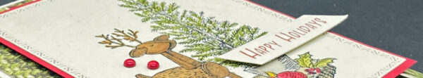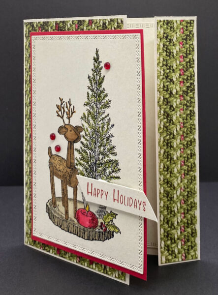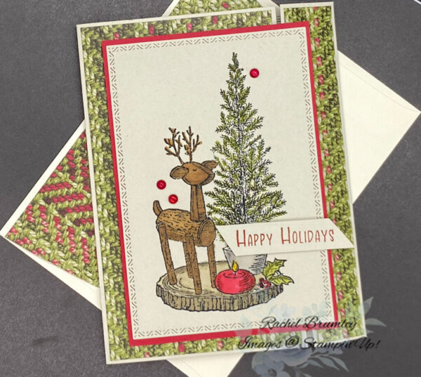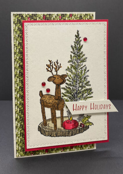 This charming holiday card features a sweet woodland reindeer standing on a rustic wood slice beside a little evergreen tree and a cozy red candle. The scene is framed with a lovely textured paper that has a green and pink mossy pattern, giving it that natural, forest-inspired feel. The “Happy Holidays” sentiment completes this warm and inviting card that’s perfect for sending cozy seasonal wishes!