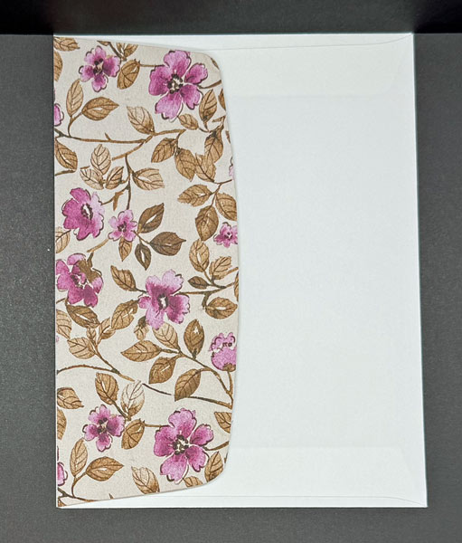 I positioned the circle sentiment 1 3/4″ down from the top of the card. Then I attached another horizontal strip of the same DSP (2 7/8″ x 3/4″) across the panel, overlapping the bottom of the circle. Finally, I adhered the flower image to the left side of the top panel.