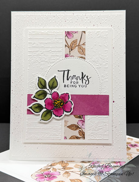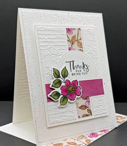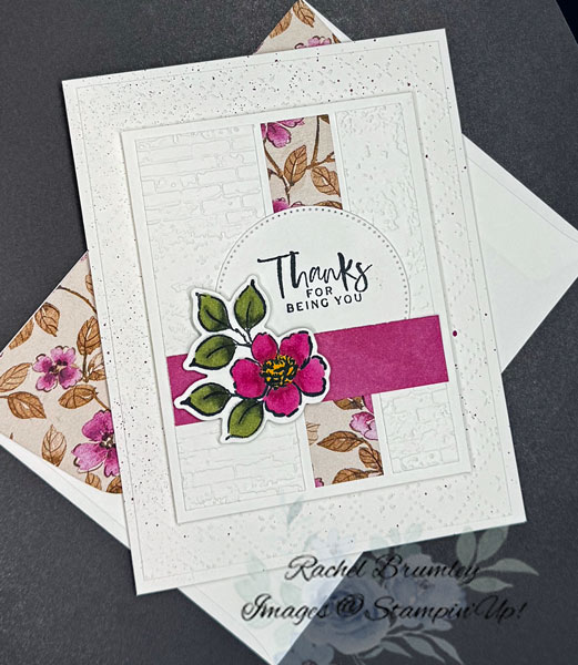 I’m absolutely loving the Charming Day Bundle for creating elegant thank you cards! This design showcases how beautifully the floral images layer together, and I added some fun texture with embossing to make the white-on-white elements really pop. The combination of the delicate Designer Series Paper with that bold magenta flower creates such a striking focal point. It’s one of those cards that looks complex but comes together surprisingly quickly – my favorite kind of project! The “Thanks for Being You” sentiment is perfect for those special people in your life who deserve a handmade card that shows you care.