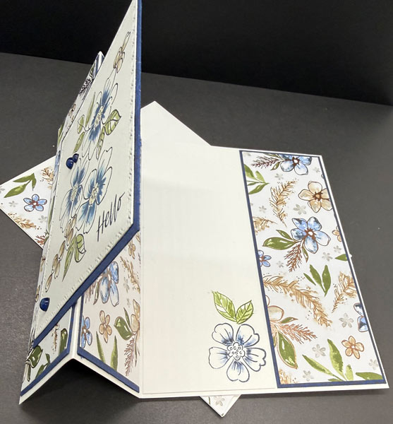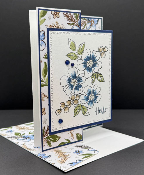 The fun fold design is what really makes this card stand out! A step card is created by layering the panels at different levels, giving the card a wonderful dimensional look that pops right off the table. The top panel steps back to reveal a peeking layer beneath, creating a cascading effect that adds depth and visual interest. It looks impressive, but once you know the secret, it’s easier to make than it looks!