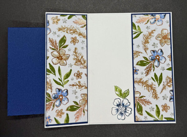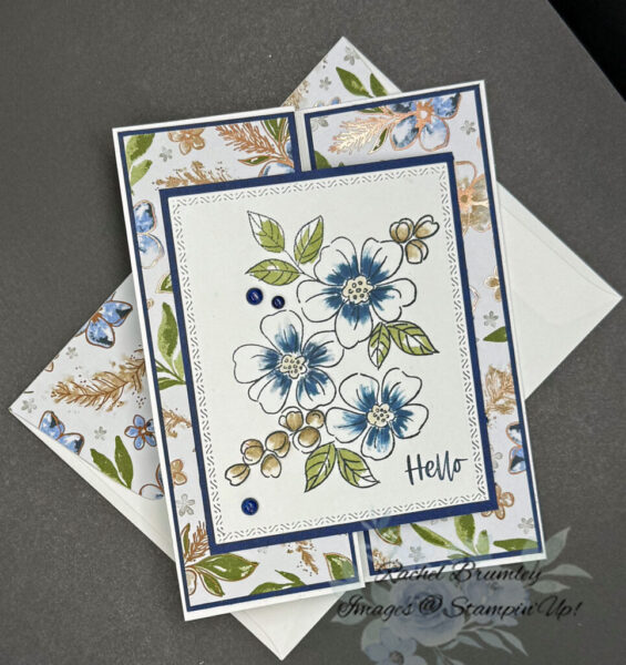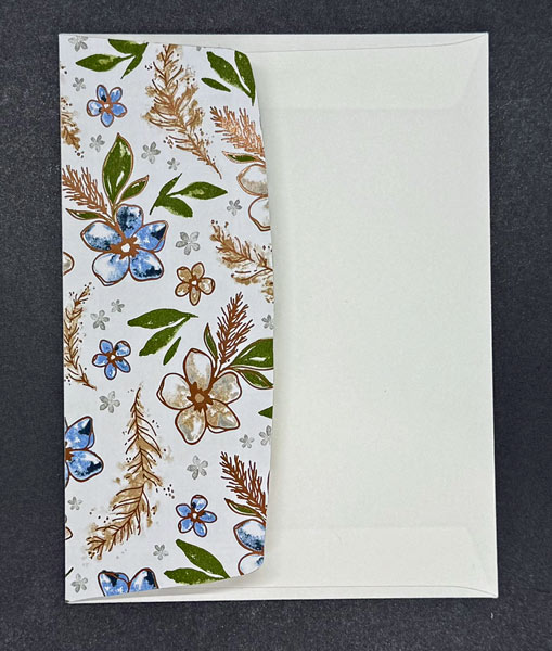 The inside of the card continues the same Designer Series Paper for a beautifully cohesive look throughout. A delicate flower is stamped in Misty Moonlight and brought to life with Misty Moonlight Stampin’ Blends, while the leaves are filled in with the Mossy Meadow Stampin’ Blends for a fresh, natural touch. To complete the polished presentation, the Designer Series Paper carries over to the envelope flap, making every detail of this card feel intentional and finished from the inside out.