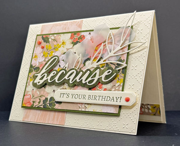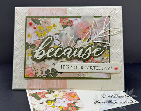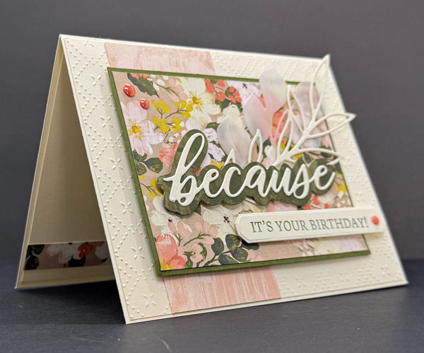 This card was so easy to make! I found inspiration from a design on Pinterest, and I loved that it required only minimal stamping and no coloring. The Brushed with Beauty Designer Series Paper (DSP) does all the heavy lifting with its gorgeous floral prints, and that scripted “because” die cut adds such an elegant touch. Add a textured background, layer everything up, and you’ve got a beautiful birthday card in no time!