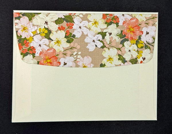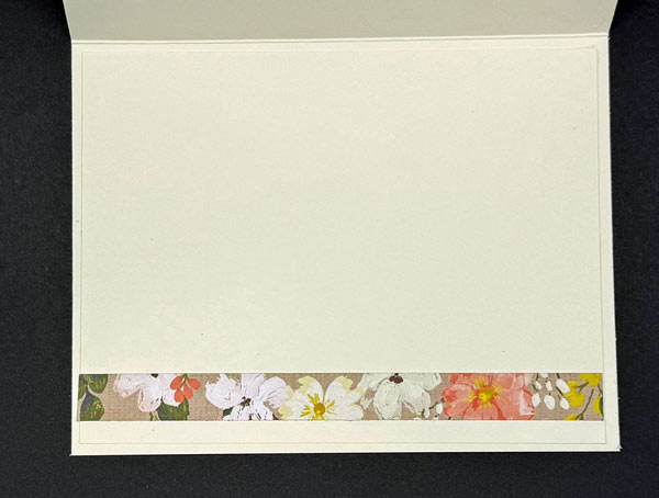 For the inside of the card, I layered Very Vanilla Cardstock cut to 5 1/4″x 4″. I then cut of strip of the Brushed with Beauty DSP (5 1/4″ x 1/2″) and attached to the bottom of Very Vanilla layer. Next I added it to the inside of the base card with Multipurpose Liquid Glue. For the envelope, I attached a strip of the Brushed with Beauty DSP (6″ x 2 1/2″) and trimmed to size.