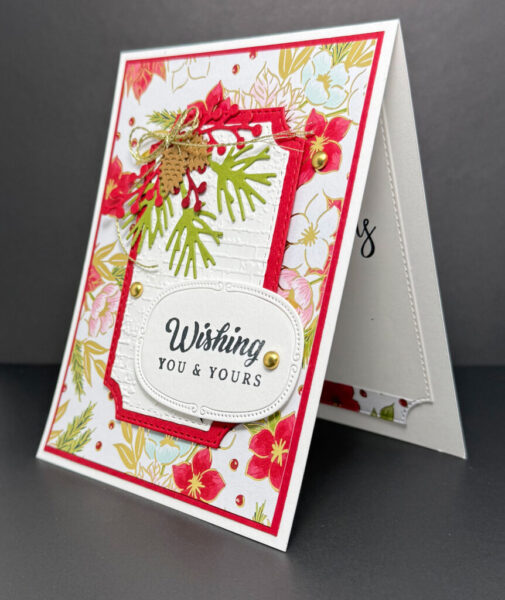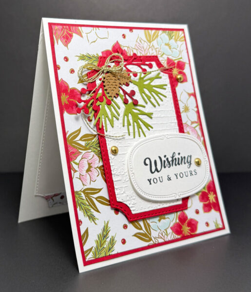 Next, I stamped my “Wishing You & Yours” sentiment from the Peaceful Season Stamp Set on Basic White cardstock and die-cut it with an oval die from the Traditional Labels Dies. I attached it with Stampin’ Dimensionals to make it really pop.