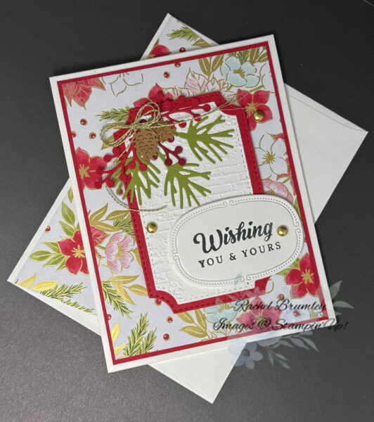 I’m absolutely loving the warm, cozy feeling this holiday card brings to my craft room! The beautiful Traditions of Christmas Designer Series Paper (DSP) caught my eye immediately with those gorgeous reds and golds, and I knew it would be perfect for creating something special for the season.