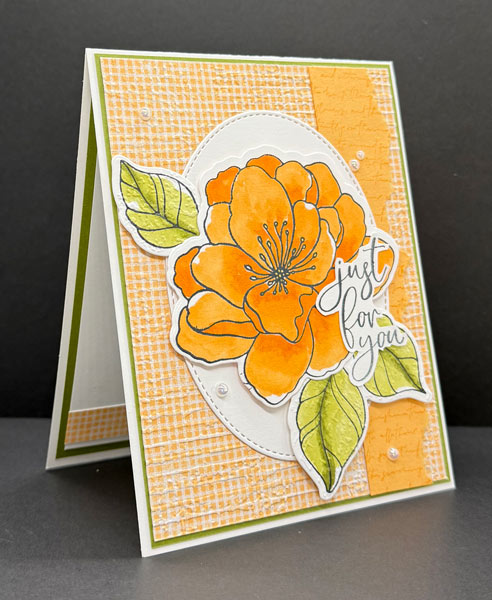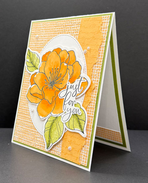 To create that soft, organic look on the right side, I cut a strip of Peach Pie Cardstock measuring 5 1/4″ x 1 1/2″ , stamped the strip with the script image from the Elements of Text Stamp Set eand gently tore one long edge. I adhered this torn strip to the right side of my card (you can see the placement in the photo). Then I die-cut a Basic White Thick Cardstock oval using the Layering Oval Dies (cutting the 4 1/2″ x 3 1/2″ size) and popped it onto the center of my card.
