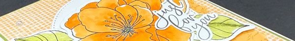Now for the fun part—the flower! I stamped the large floral image onto a 3 1/2″ x 3 1/2″ piece of Basic White Thick Cardstock, then colored it with my Peach Pie Stampin’ Blends, using the darker shade to add depth in the center of the bloom. For the leaves, I grabbed a scrap of Basic White Thick Cardstock and stamped both the two-leaf image and single leaf image with Tuxedo Black Memento Ink, then colored them in with my Old Olive Stampin’ Blends.