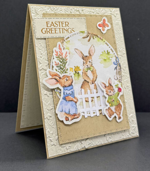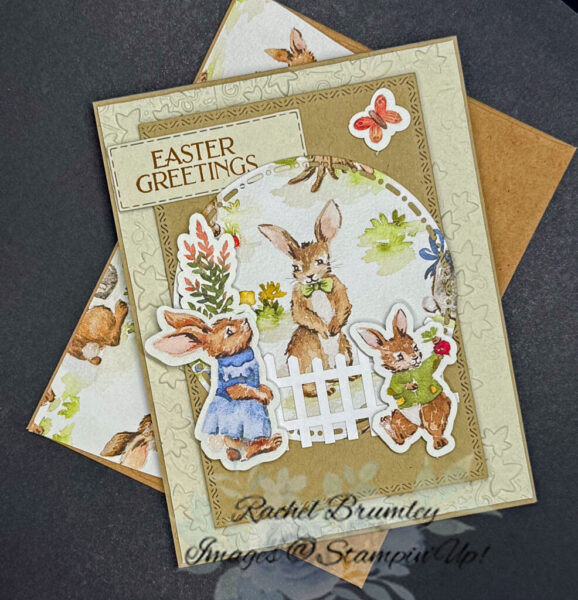 The bunnies, fence, flowers, and butterflies are all stickers from the Storybook Moments DSP. I glued the fence to the bottom of the circle with Multipurpose Liquid Glue, and attached the bunnies and flower stems with Stampin’ Dimensionals. For the mini butterfly, I used Mini Glue Dots. Lastly, I stamped the sentiment with Pecan Pie Ink on Crumb Cake Cardstock and cut it out with the coordinating die from the Textured Notes Dies.