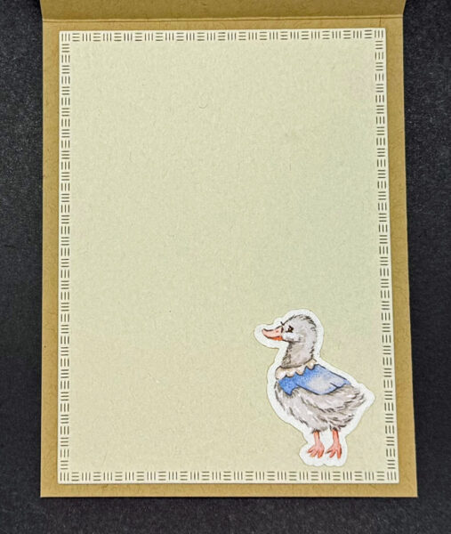 For the inside of the card, I cut a layer of Basic Beige Cardstock with the largest die in the Textured Notes Dies and adhered it in place. The duckling was glued to the lower right-hand side with Multipurpose Liquid Glue. To complete the set, I used the same DSP from the front of the card, adhered it to the envelope flap with Multipurpose Liquid Glue, and trimmed it to size.