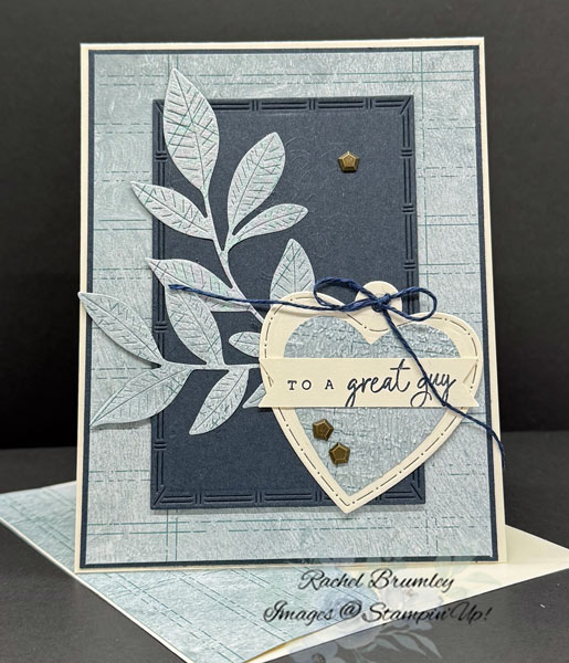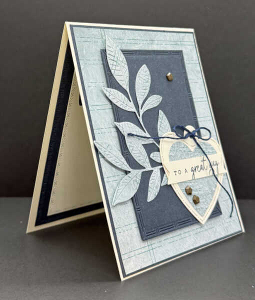 For the textured panel, I die cut Secret Sea Cardstock (4 1/2″ x 3″) using the Textured Notes Dies.