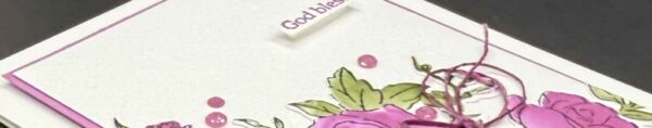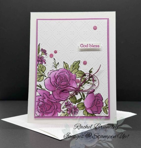 The finishing touches are what really make this card shine! A delicate bow of Petunia Pop twine is nestled right in the middle of those beautiful blooms, and a handful of shimmery Petunia Pop rhinestones are scattered across the card for just the right amount of sparkle. The simple “God bless” sentiment keeps the message clean and heartfelt — making this the perfect card for so many occasions!