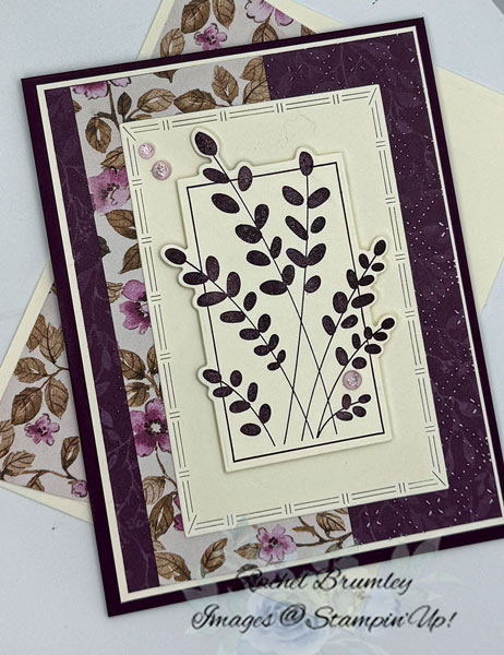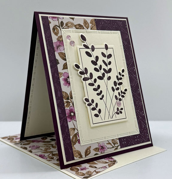 Now for the fun part – stamping! I used Blackberry Bliss ink to stamp the lovely sprigs image from the Friendly Foliage Bundle right onto that inner rectangle panel.