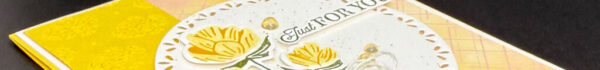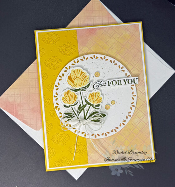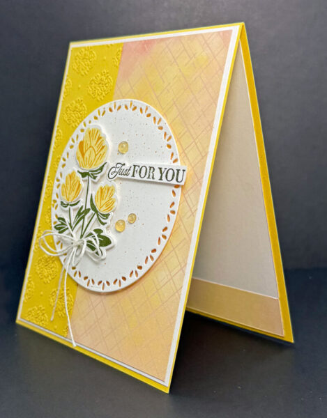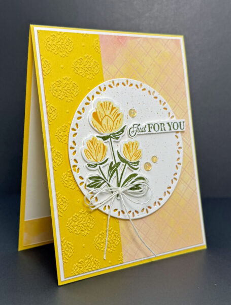 I’m so excited to share this gorgeous card I made using the Pretty Florals Bundle! I love how the golden yellow flowers paired with the soft peachy background create such a warm, autumn feel. The left side features embossed yellow cardstock that adds beautiful texture, while the right side has this lovely crosshatch patterned paper. I showcased the Pretty Florals images on a white circle, die cutting the flowers and leaves for dimension, then finished it with a simple white bow and a few sparkly yellow sequins. The “Just FOR YOU” sentiment makes it perfect for brightening someone’s day during this beautiful fall season!