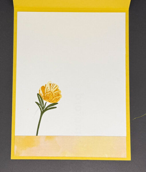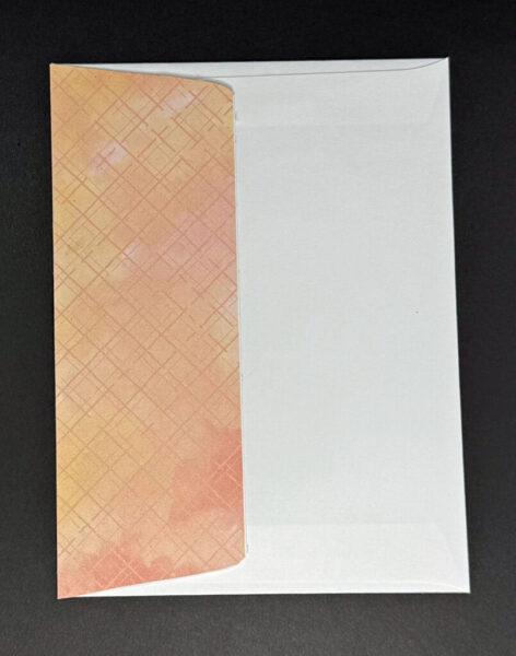 For the card interior, I added a strip of matching DSP (4″ x 3/4″) and stamped a single floral image with leaves using the same technique as the front. On the envelope, I adhered a coordinating strip of DSP (6″ x 2 1/2″) to the flap.