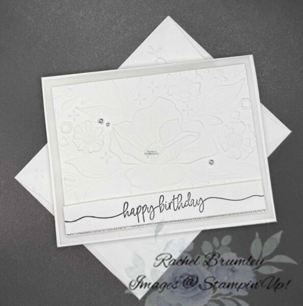 A few silver rhinestones scattered across the embossed panel are the perfect finishing touch — just enough sparkle to make this card feel special! This is one of those cards that looks like it took forever but comes together so quickly, which makes it perfect for stamping up a whole batch at once. Whether you’re a beginner or a seasoned stamper, this design is a total winner!