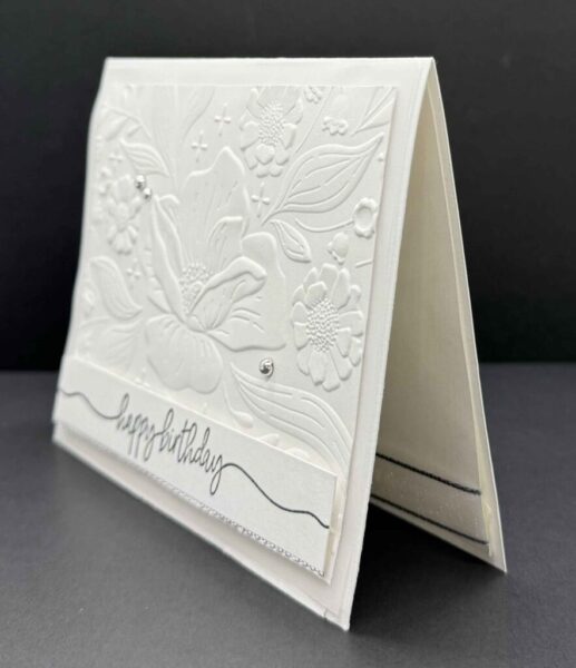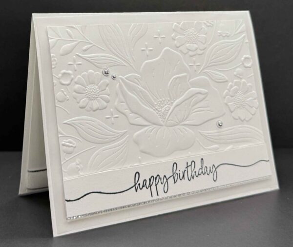 Sometimes simple is simply stunning, and that’s exactly what I had in mind when I created this beautiful white-on-white birthday card! The star of the show is the Floral Spray 3D Embossing Folder, and wow — does it deliver! The gorgeous raised floral design adds so much texture and dimension, all without a single drop of ink on that embossed panel.