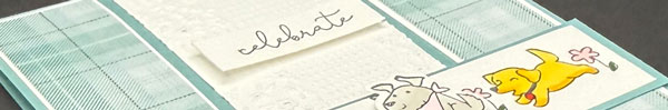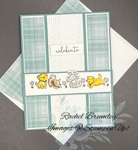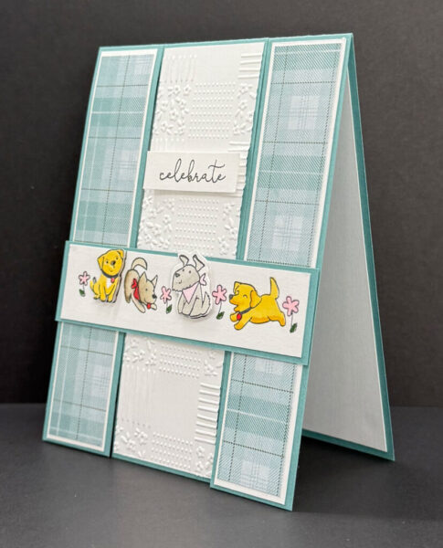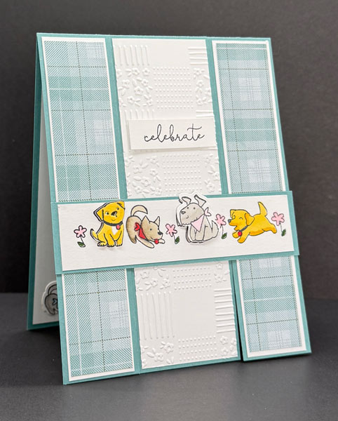 I cut the image strip to 4″ x 1″ and attached it to the Lost Lagoon Cardstock bridge. I then stamped two individual puppy images, coloring one in Daffodil Delight and the other in Gray Granite Stampin’ Blends. After fussy cutting both, I attached them on top of their coordinating puppies on the bridge — see the photo for placement. Finally, the sentiment was stamped in Tuxedo Black Ink on Basic White Cardstock, trimmed to 1½” x ½”, and adhered to the center panel using Stampin’ Dimensionals.