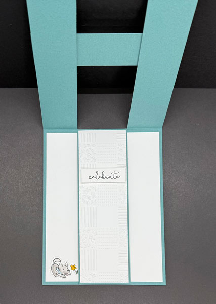 To begin, I cut Lost Lagoon Cardstock to 8½” x 5½” and folded it in half using a Bone Folder for a sharper crease. I then cut into the base card 1¼” up to the score line, turned it around, and repeated the same cut on the other side, creating two 1¼” flaps — one on each side — which form the two side panels. I layered each panel with Basic White Cardstock cut to 5⅜” x 1⅛”, then added the Timeless Plaid Designer Series Paper, cut to 5¼” x 1″, on top of the Basic White. For the center panel, I embossed a piece of Basic White Cardstock cut to 5⅜” x 1¾” using the All in a Row Embossing Folder, then attached it to the center Lost Lagoon Cardstock panel.