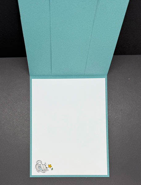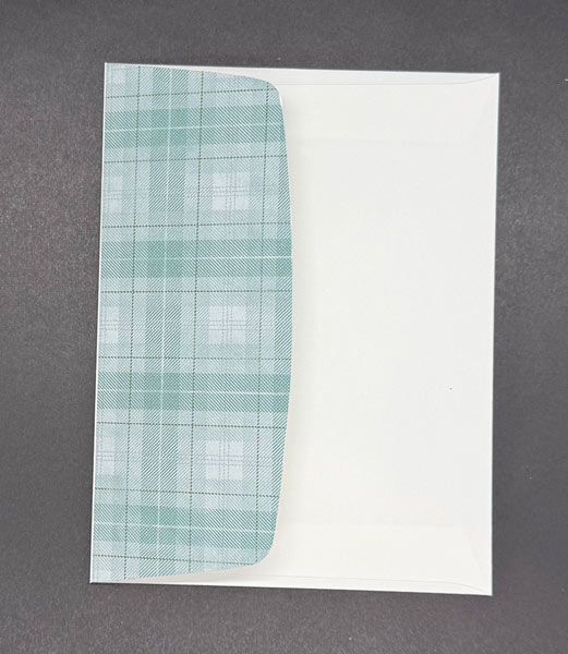 I added a layer of Basic White Cardstock cut to 5¼” x 4″ and attached it to the base card. I then stamped a small puppy image using Tuxedo Black Ink and colored it in with Gray Granite for the body, Lost Lagoon for the scarf, Pretty in Pink for the flower, and Garden Green Stampin’ Blends for the leaves. I also attached the Timeless Plaid Designer Series Paper to the envelope flap and trimmed it to size, giving the finished project a more cohesive look.